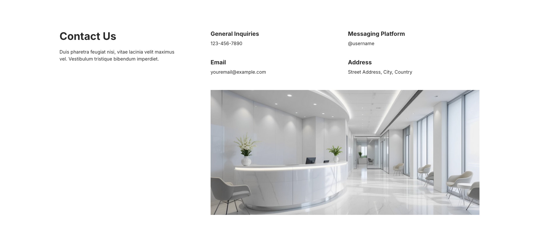 此聯絡區塊整合文字說明與多項聯絡資訊,採左右分欄配置,清楚呈現聯絡方式,適合作為頁面結尾的聯絡轉換區塊或聯絡頁使用。
