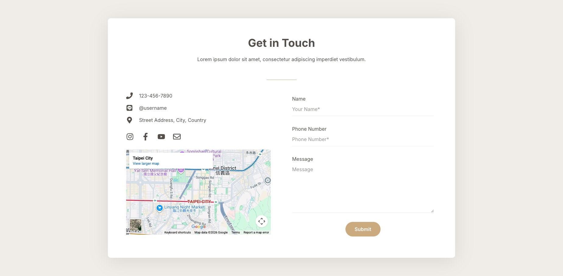 此聯絡區塊整合聯絡資訊、社群連結、地圖與表單,結構清晰,適合用於企業或專業服務的主要聯絡區塊。
