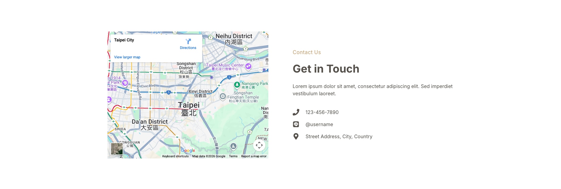 此聯絡版型以地圖搭配聯絡資訊呈現,清楚顯示位置與多元聯繫方式,讓訪客能快速採取行動。適合用於各類形象官網版面,提升可達性並縮短洽詢流程。