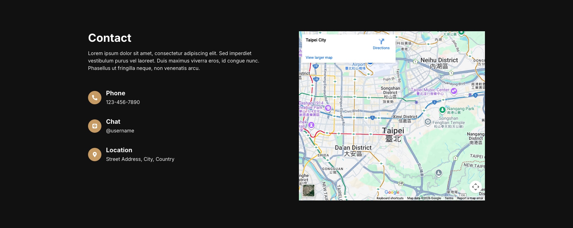 此聯絡區塊左側集中呈現聯絡方式,右側搭配 Google 地圖強化定位,適合放在頁面底部提升轉換並提供清晰的到訪指引。