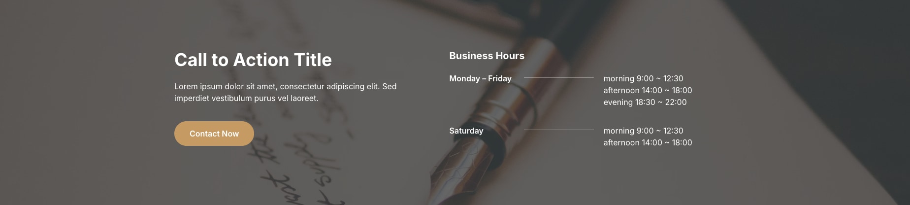 此 CTA 區塊結合行動標題與營業時間資訊,左側聚焦主要行動訴求與按鈕,右側呈現營業時段配置,適合用於需要同步傳達聯絡行動與服務時段的頁面。