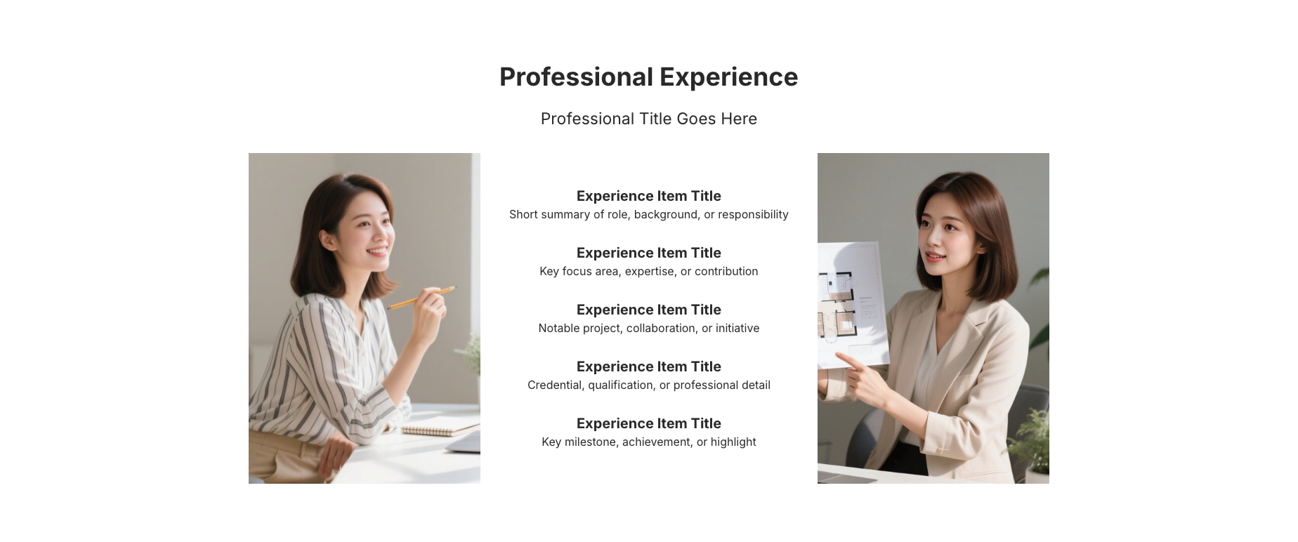 此專業經歷版型以中欄條列方式呈現重點背景與里程項目,左右保留圖像區域作為視覺輔助,適合用於個人介紹、團隊資歷或品牌信任建立。