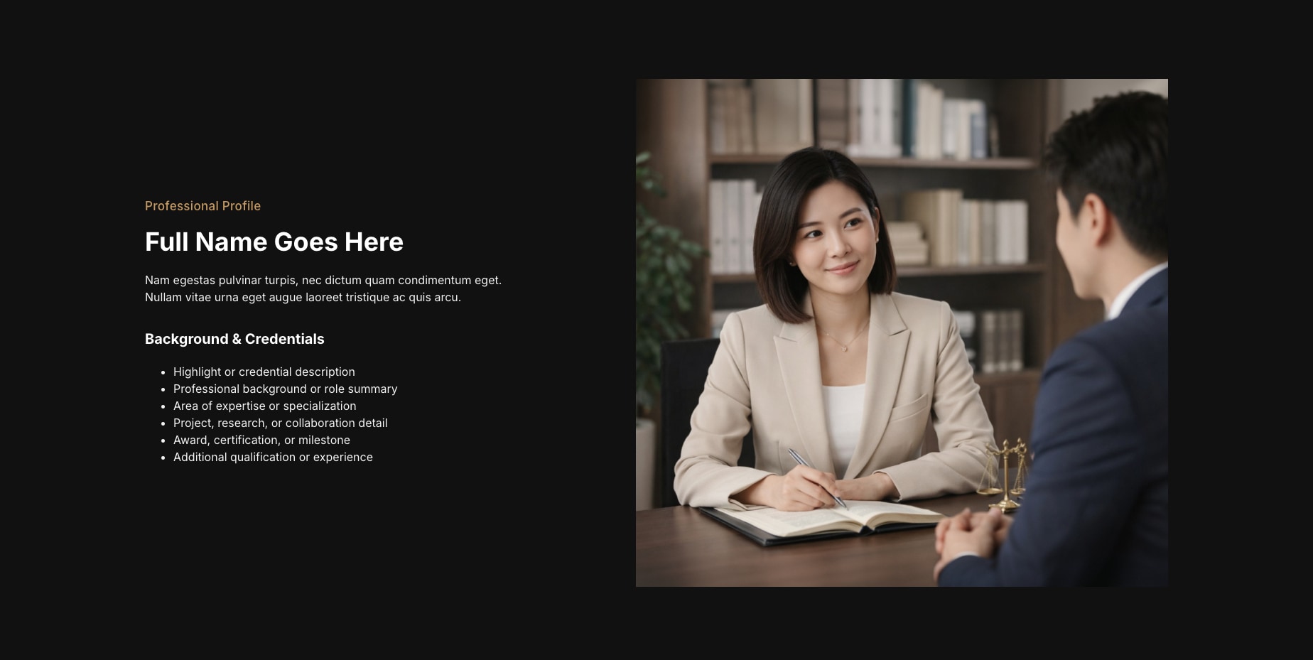 此專業背景版型以左側文字區塊整理個人介紹與資歷重點,右側配置形象圖像強化視覺印象,適合用於專業人物介紹、個人資歷說明或形象頁面。