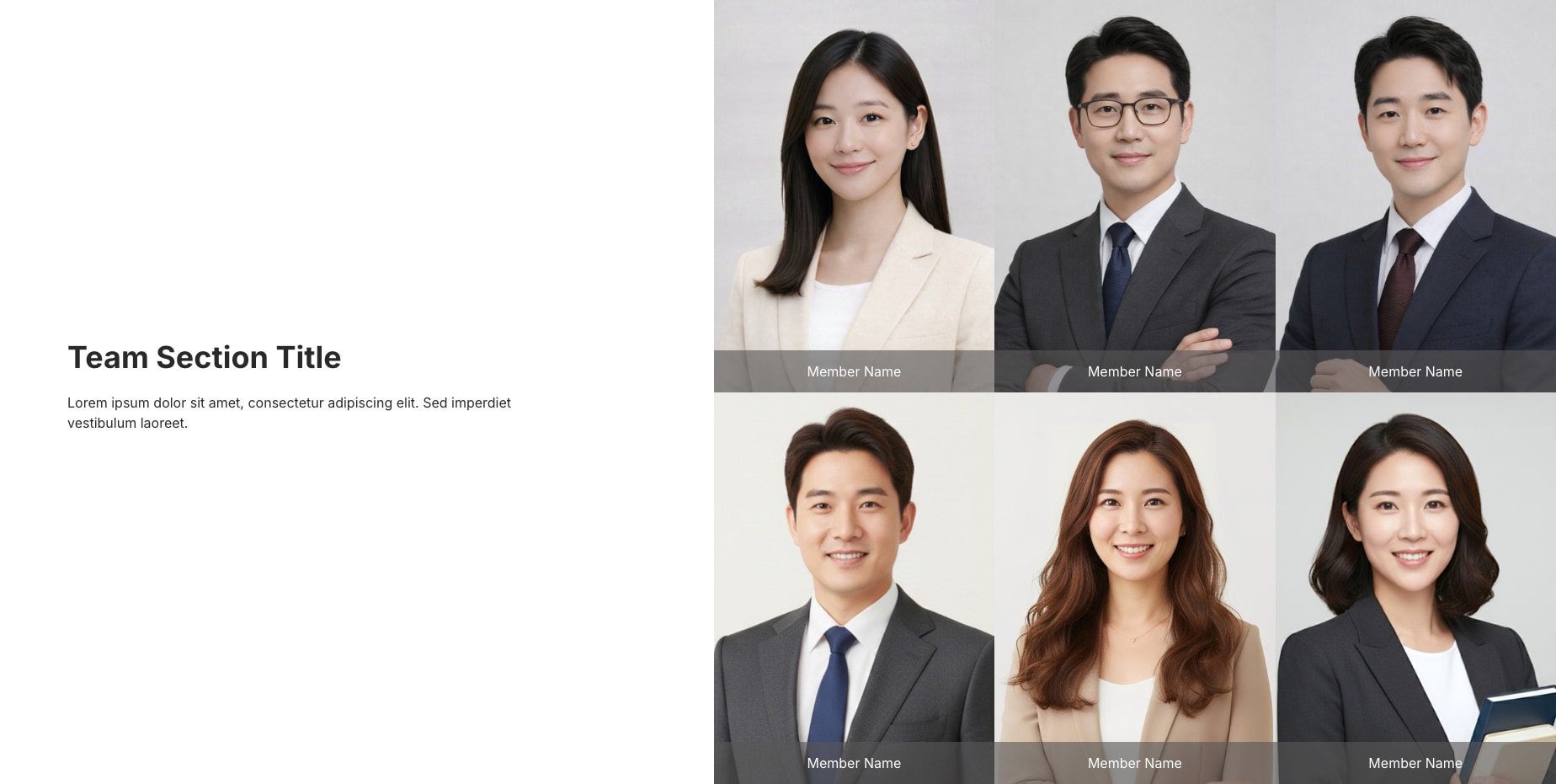 此團隊區塊以網格方式呈現成員資訊,結合照片與姓名標示,傳達組織結構與專業分工,建立信任感。