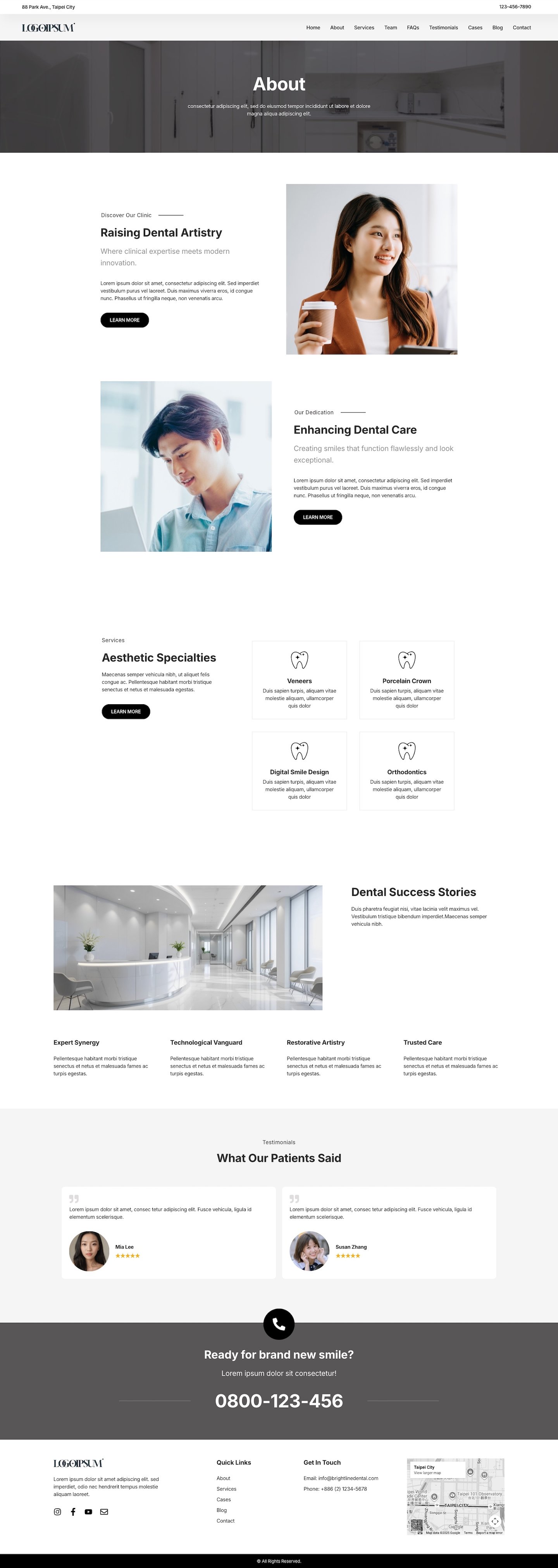 此頁面版型適合診所或醫療品牌的 About 介紹,包含團隊理念、核心服務、環境與優勢展示、患者見證,完整呈現專業形象與品牌故事。